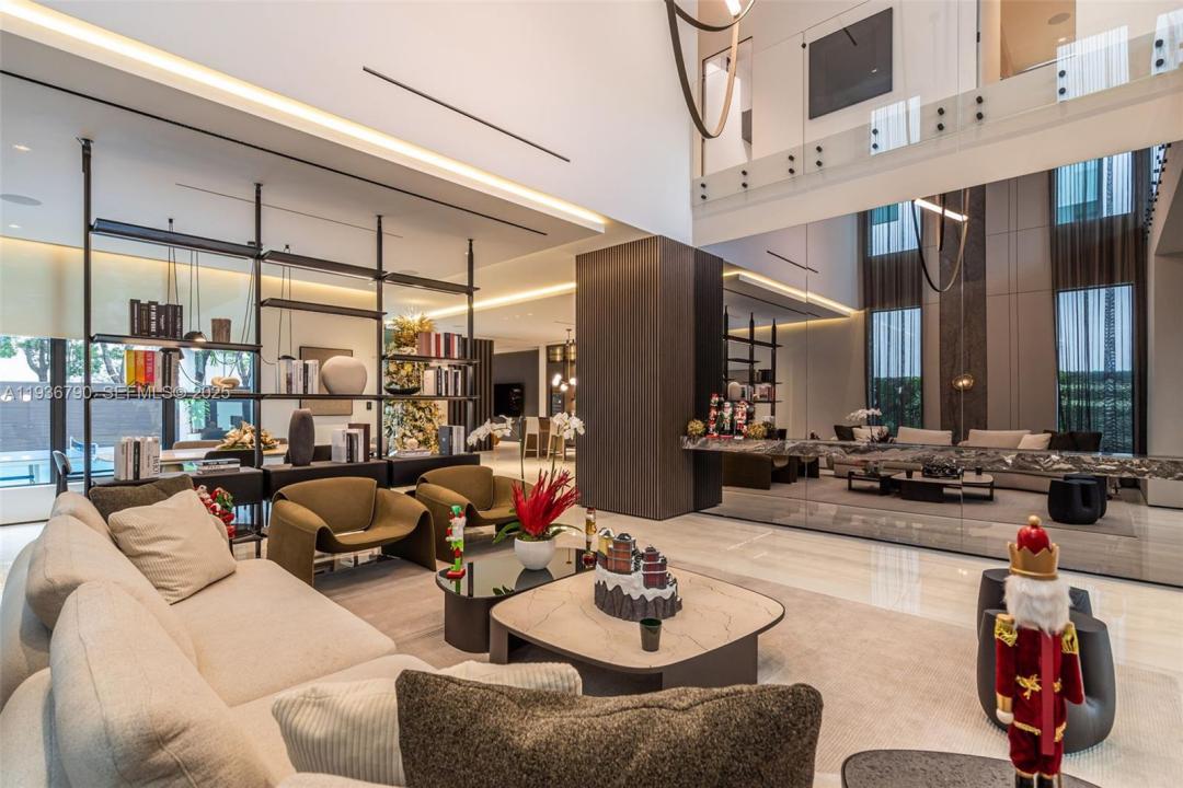 Interiors showcasing sculptural contemporary pieces and anchored by a striking Lexington central shelving unit by Poliform, conceived as a gallery-style architectural focal point. The residence is finished with large-format marble-design flooring and flawless Level 5 smooth wall finishes, reflecting a museum-quality execution. Custom sheer and blackout drapery systems provide refined light control and privacy throughout.